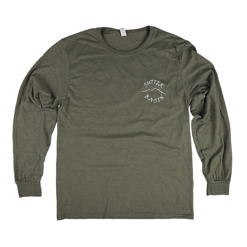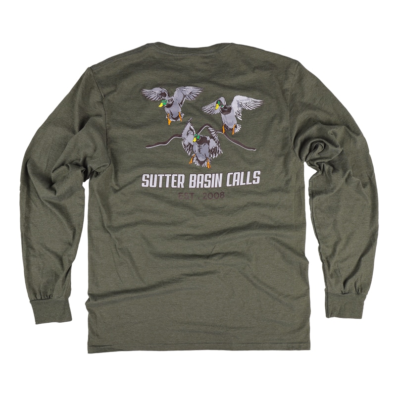 Sutter Basin Calls Long Sleeve T-Shirt with the Mallards Over the Buttes Logo on the back.