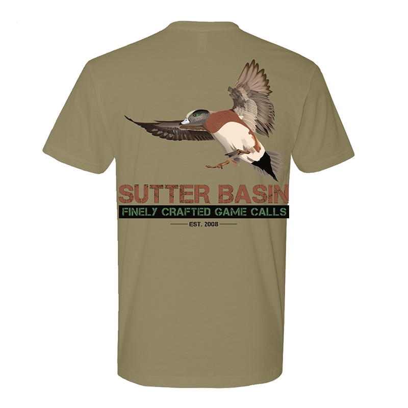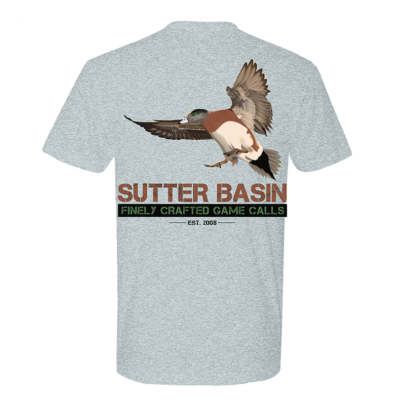 Sutter Basin Calls Short Sleeve T-Shirt with the Wigeon EST 2008 Logo on the back. Available in Olive or Heather Grey.
